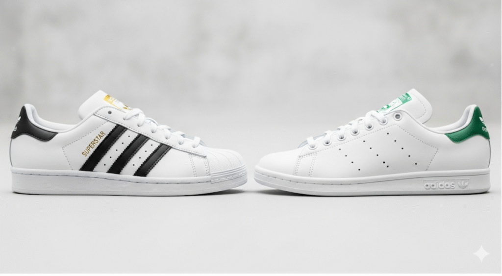 最大の違いは、前述の通りスーパースターがバスケットボールシューズ由来であるのに対し、スタンスミスはテニスシューズをルーツに持つ点です。このルーツの違いが、デザインの細部に表れています。
