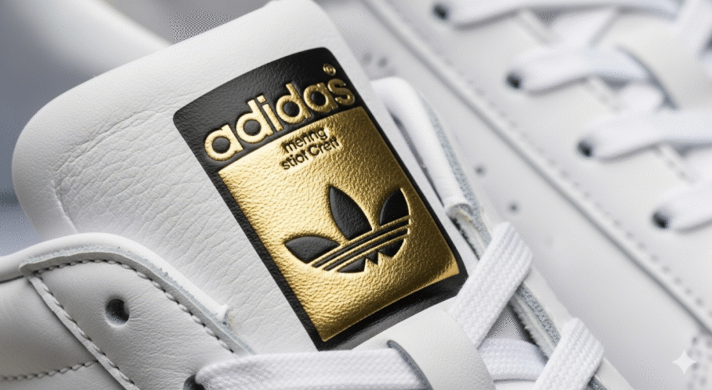 これは、スニーカーのシュータン(ベロ)部分に配置された、アディダスのトレフォイル(三つ葉)ロゴが金色でプリントまたは型押しされたラベル(タグ)のことを指す、スニーカーファンの間で使われる通称です。