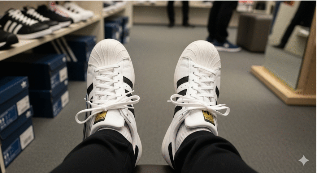 結論として、現行のスタンダードなスーパースター(SUPERSTARモデルなど)は、アディダスのスニーカーの中では「標準的、もしくはやや広め(大きめ)」のサイズ感とされています。
