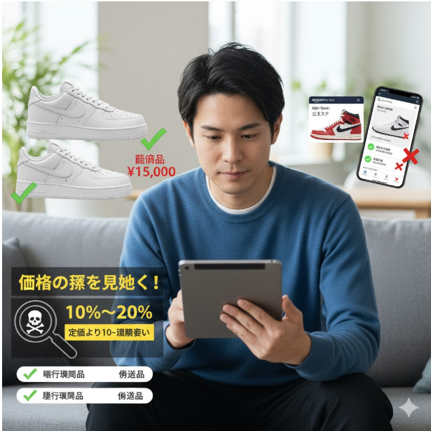 例えば、定価15,000円のエアフォース1が7,000円で売られている、なんていうのは、もう論外ですね。