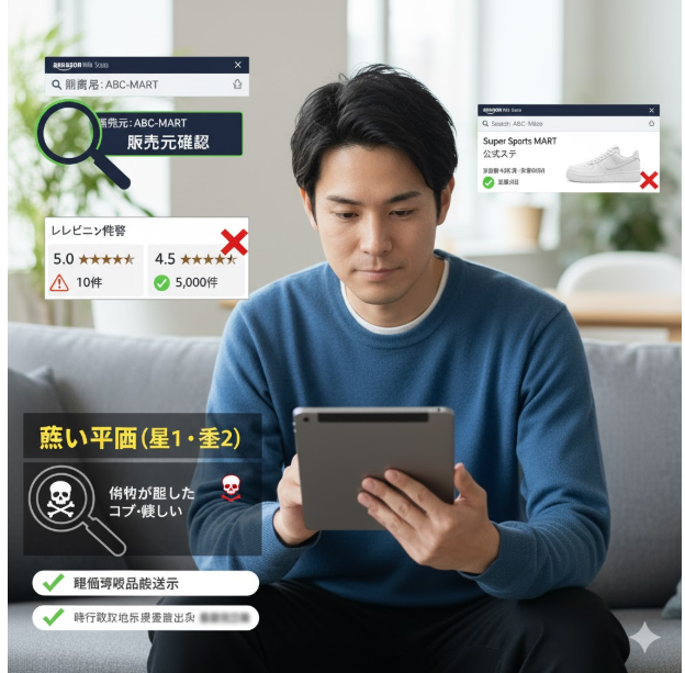 ゼビオなどの公式ストアフロント以外、つまり「サードパーティ(第三者)販売者」から買うことを検討する場合は、その販売者が本当に信頼できるかどうかの「目利き」が必須になります。