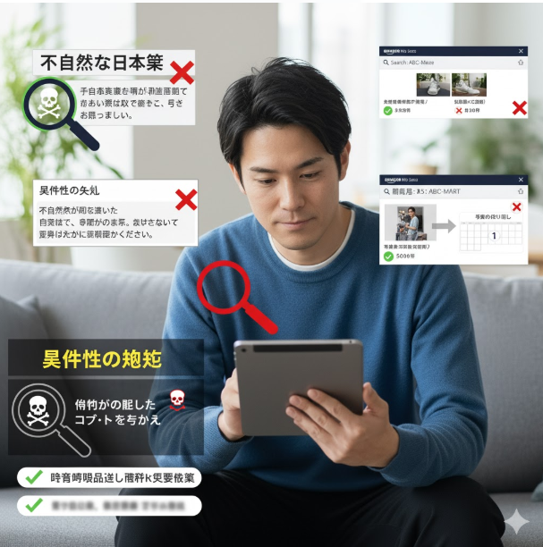 - 不自然な日本語 機械翻訳で生成したような、文法や言い回しがおかしい日本語のレビューがやたらと多い。「私はこの靴を深く愛しています」のような、日本人なら使わない直訳的な表現が散見される場合は要注意です。
