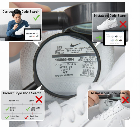 | 内側サイズラベル:スタイルコード | 「XXXXXX-XXX」が実物のモデル/カラーと一致する。Google検索で同じ商品がヒットする。 | コードが実物と一致しない。検索すると別の靴が表示されるか、存在しないコード。 |