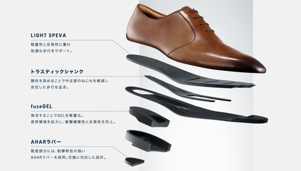 日本を代表する総合スポーツ用品メーカーであるアシックスが、ランニングシューズなどで培ってきた足に関する膨大なデータと人間工学に基づいた技術を、革靴というフォーマットに落とし込んでいます。