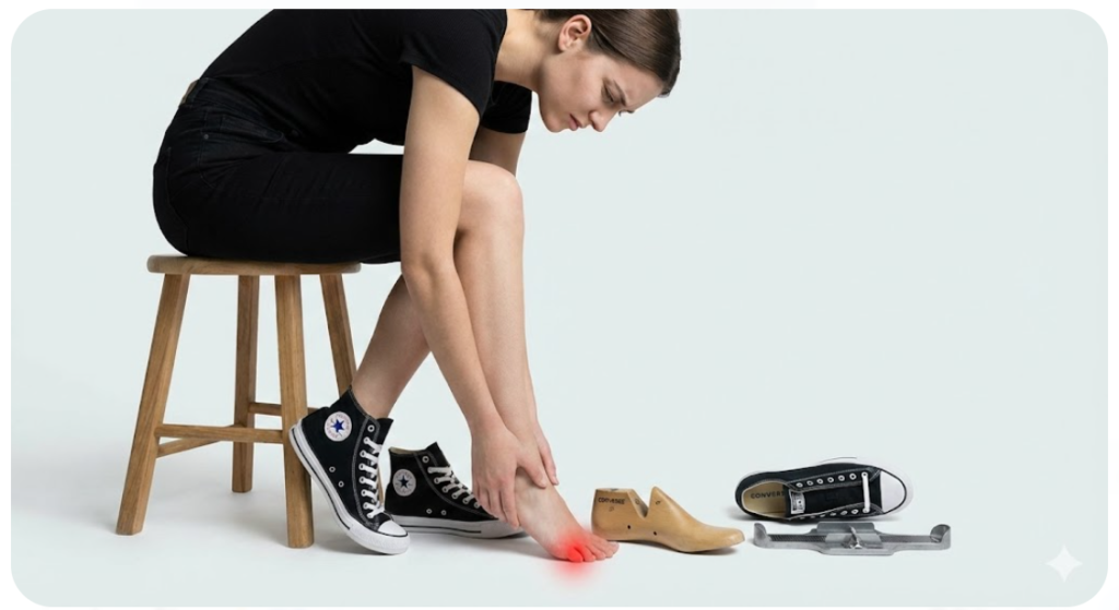 コンバースユーザーを悩ませるもう一つの大きな問題が、「小指の激痛」です。長時間履いていると、小指の側面が赤く腫れ上がったり、タコができたり、ひどい場合には「内反小趾(ないはんしょうし)」のような変形を招くこともあります。