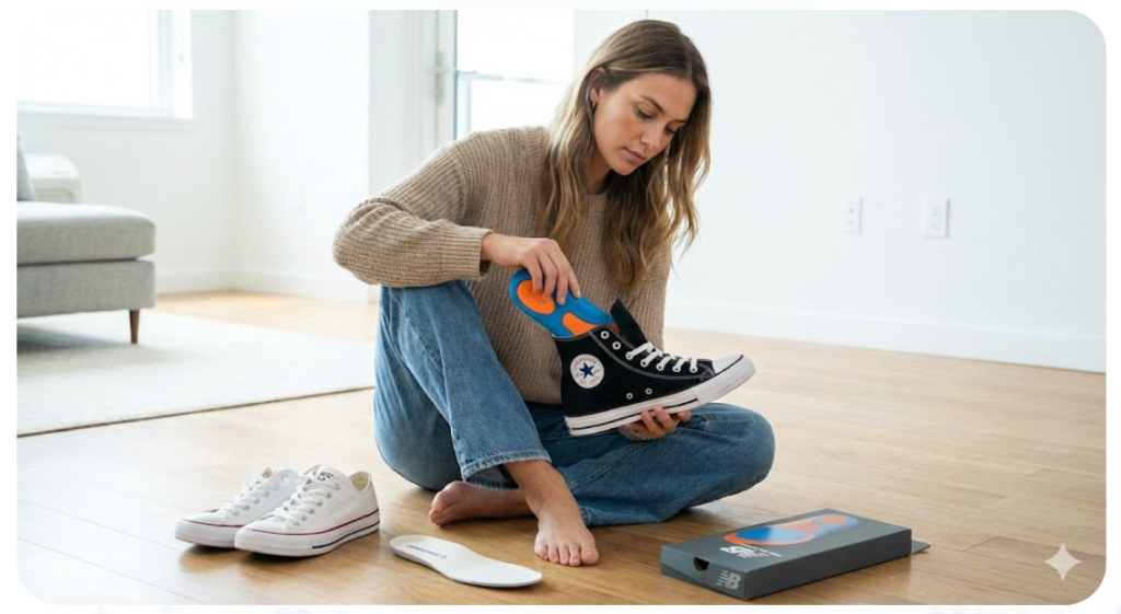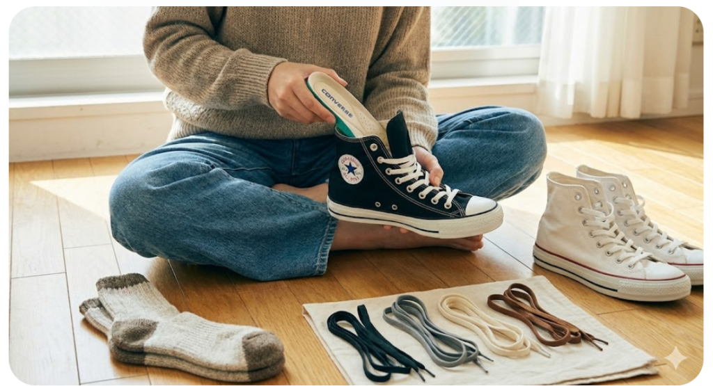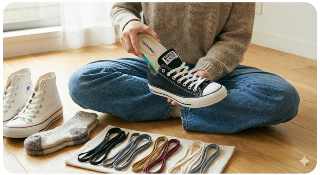 既存のコンバースであっても、後付けのアイテムやちょっとした調整テクニックを駆使することで、その履き心地を劇的に向上させることが可能です。