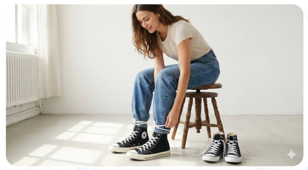 - シルエットの美しさ:ここが重要です。サイズが大きい分、靴紐(シューレース)をギュッと強く締め上げることができます。すると、左右のハトメ飾り(羽根)が近づき、ヴィンテージのオールスターのような細長く美しいシルエットが完成します。ジャストサイズで紐がだらしなく開いた状態よりも、遥かにお洒落に見えます。