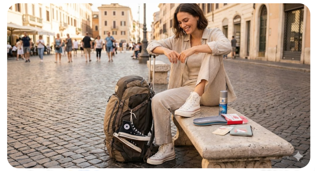 普段は気にならない「底の薄さ」が、ボディブローのように効いてくるのです。どうしても旅行にコンバースを履いていきたい場合は、以下の「完全装備」で臨むことを強く推奨します。