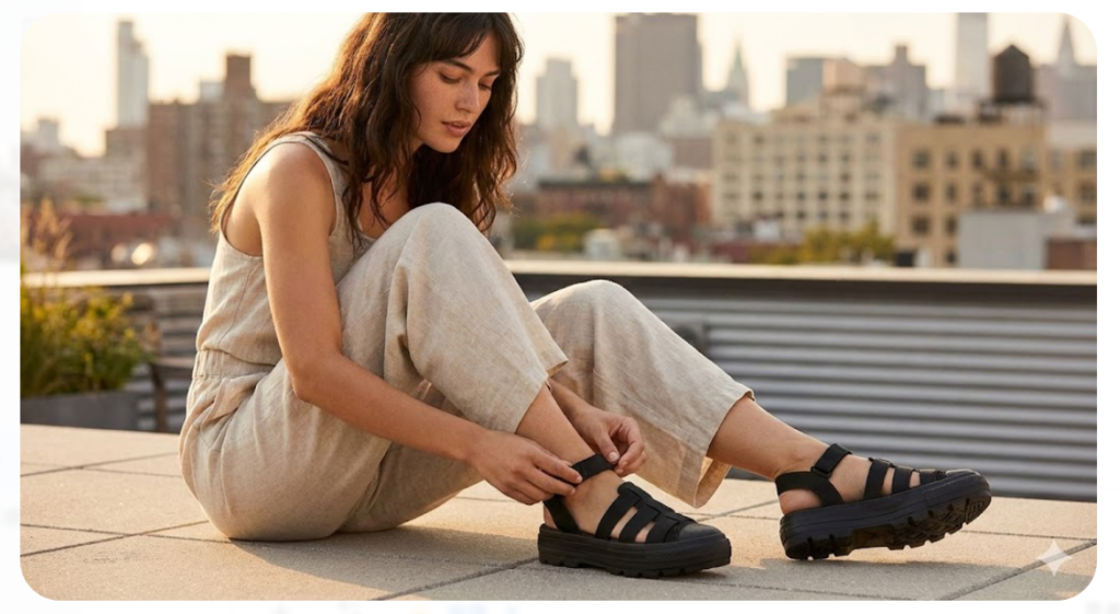 足を出すスタイルが多い方は、無理なサイズアップは避けて、ジャストサイズ(+0.5cm程度)を選び、スマートに見せる方が全体のバランスは綺麗にまとまります。
