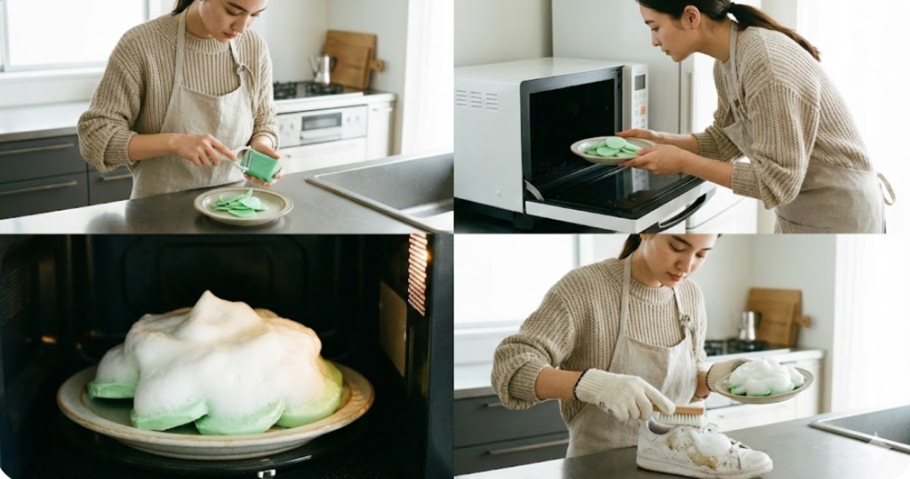 どうしても落ちない局所的な汚れに対して、裏技的に使えるのが「レンチンマロ」です。これは、固形のウタマロ石けんを電子レンジで加熱し、発泡させることで洗浄力をブーストさせるテクニックです。