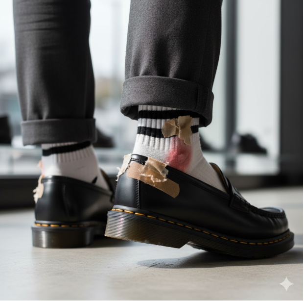 甲周りの圧迫感と並んで、マーチンローファーの悩みとして非常に多いのが「かかと」と「くるぶし」の靴擦れです。