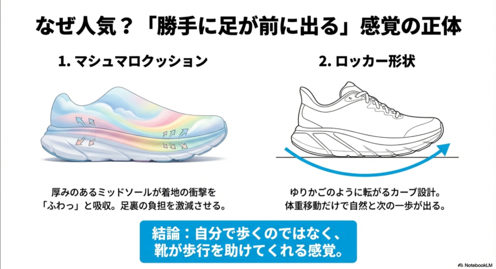 これは単に厚いからではなく、ソール形状の工夫が効いているからです。ここがホカの“体験価値”の核かなと思います。