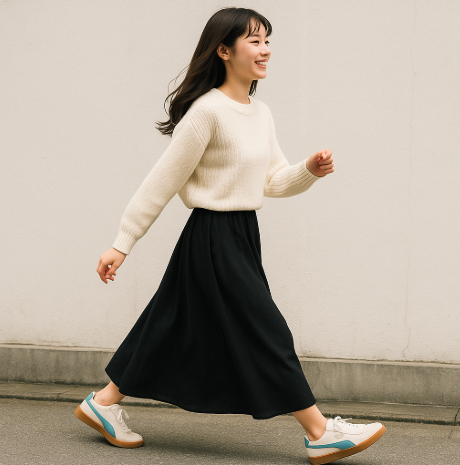 - ロングスカートやワンピース: レディースの場合、フェミニンなアイテムと合わせる「甘辛ミックス」もおすすめです。足元をスニーカーでカジュアルダウンさせることで、気取りすぎない、こなれた印象になります。