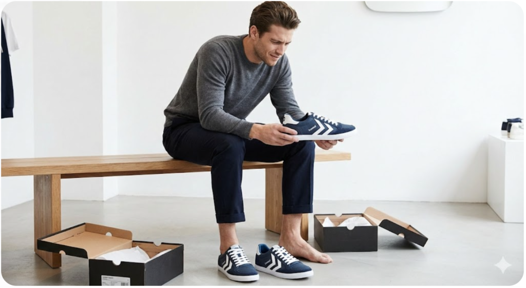 私自身、普段はナイキやニューバランスで27.0cmをジャストサイズで履いていますが、初めてヒュンメルの『SLIMMER STADIL』を同じ27.0cmで購入した際、あまりの横幅の狭さに小指が悲鳴を上げ、泣く泣くサイズ交換をした苦い経験があります。