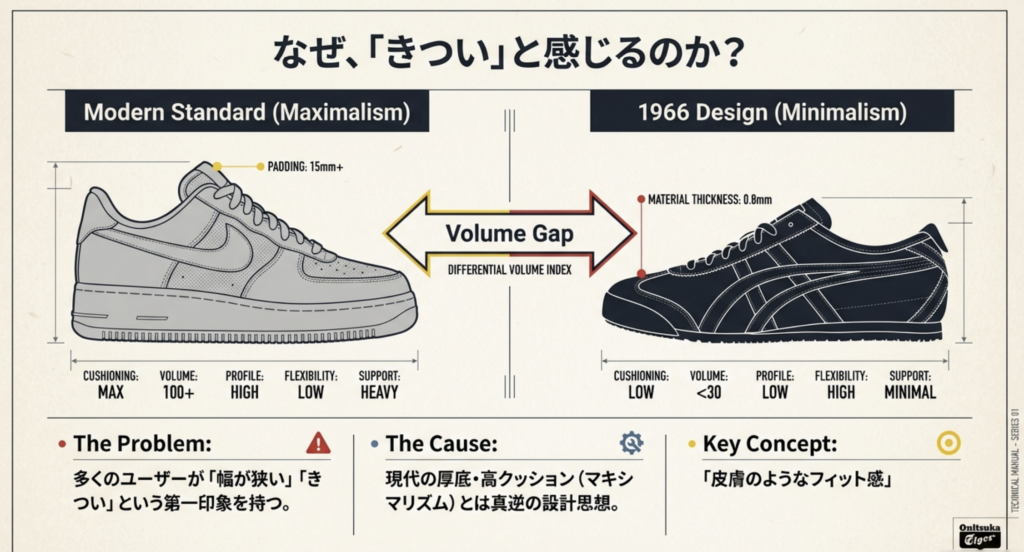 なぜ多くのユーザーがサイズ選びに悩むのか、その背景にある歴史的な設計思想や現代のスニーカーとの構造的な違いから、まずはじっくりと紐解いていこうかなと思います。