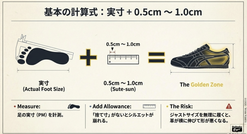 その「足の実寸 + 0.5cm」を最低ラインの基準サイズとし、幅広の方や厚手の靴下を好む方はさらにハーフサイズアップした数値を選ぶのが、最も理にかなったロジックです。