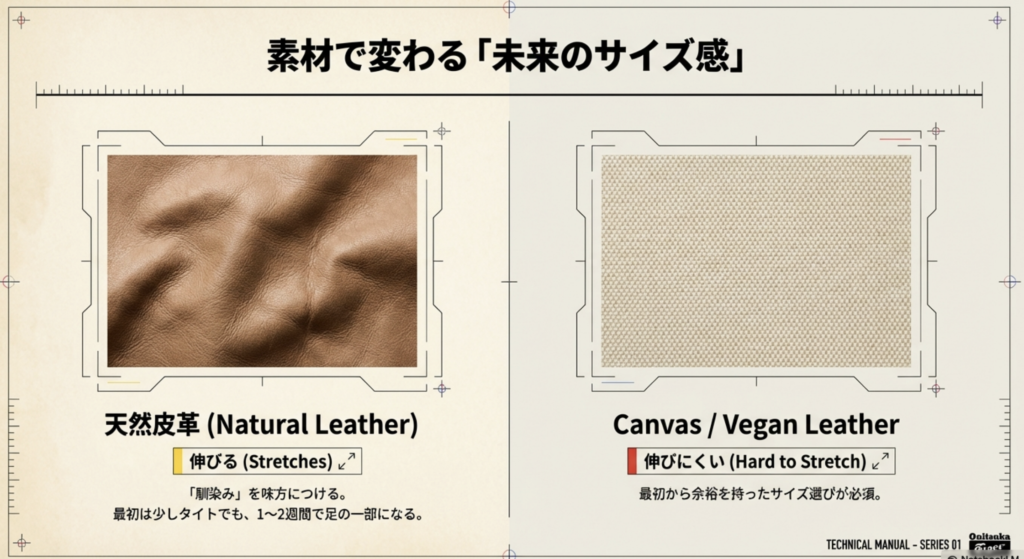 逆に、ヴィーガンレザー(合成皮革)やキャンバス生地のモデルは伸びにくい傾向があるため、最初からある程度の余裕を持ったサイズ選びが絶対に欠かせませんよ。
