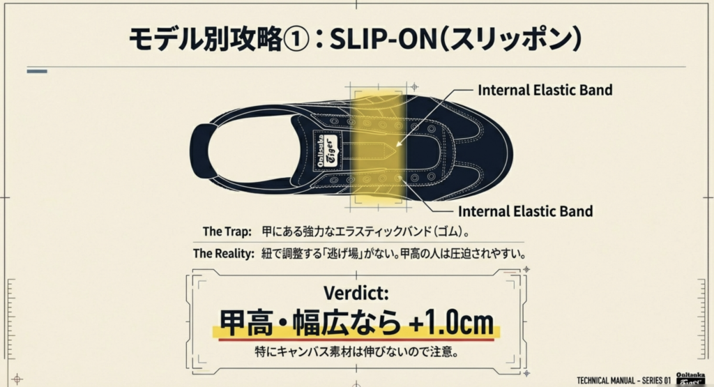甲高・幅広の自覚があるなら、迷わず通常より1.0cmアップを選ぶのが正解です。一方で、素材がレザーのスリッポンであれば、ある程度の横方向への伸びは期待できます。
