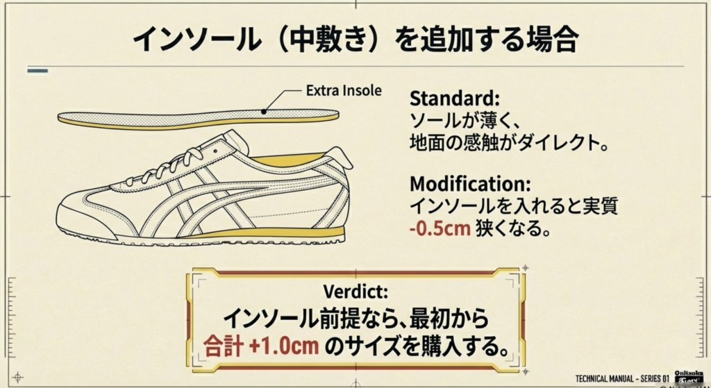 ただし、ここで絶対に注意すべきはサイズとの兼ね合い。インソールには必ず厚みがあるため、それを入れるだけで靴の内部サイズが実質ハーフサイズ分(約0.5cm)ほど小さくなってしまいます。