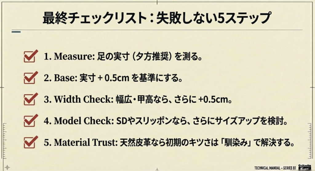 - STEP 3:幅広・甲高の自覚があるなら、さらに +0.5cm(合計1.0cmアップ)する