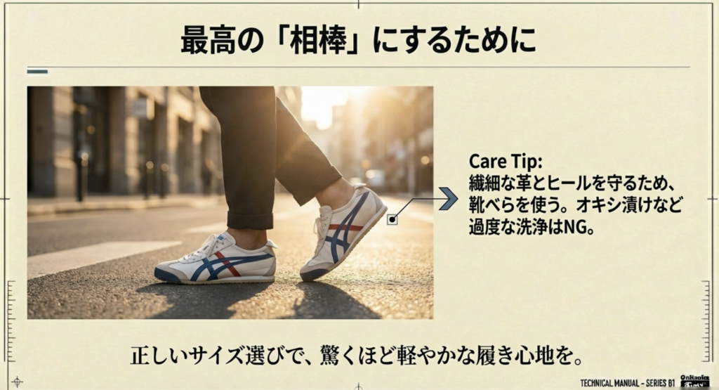 メキシコ66は、正しくサイズを選べば、驚くほど軽やかでどこまでも歩いていけそうな「最高の相棒」になってくれます。