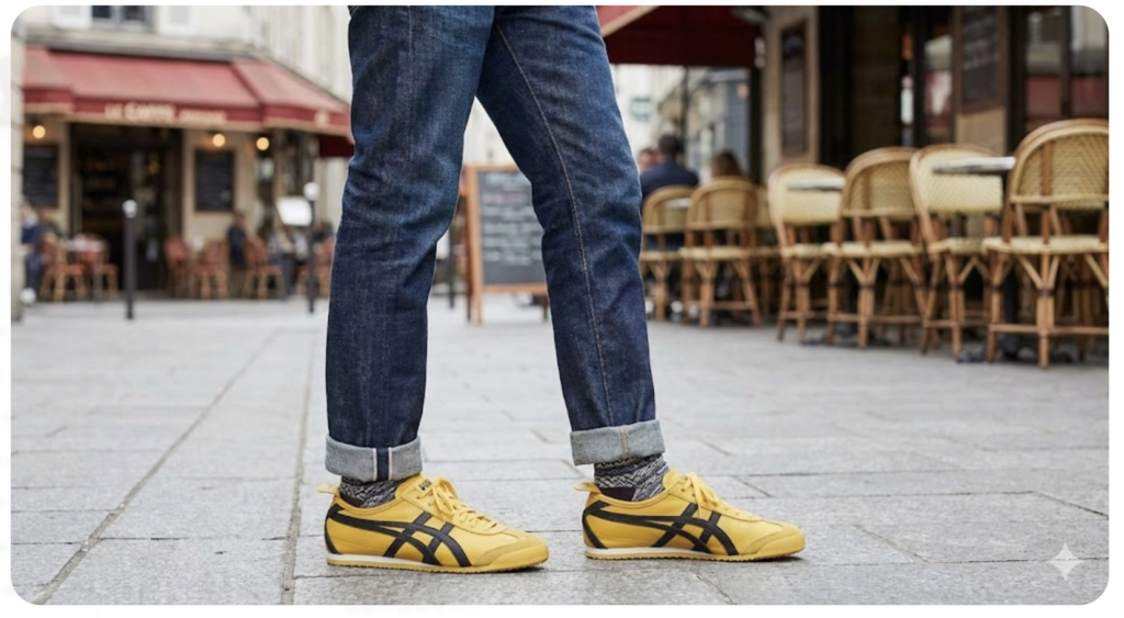 オニツカタイガーを最も美しく、かつトラブルなく履きこなすための「黄金の裾丈」は、くるぶしがわずかに露出するアンクル丈(9分丈)です。