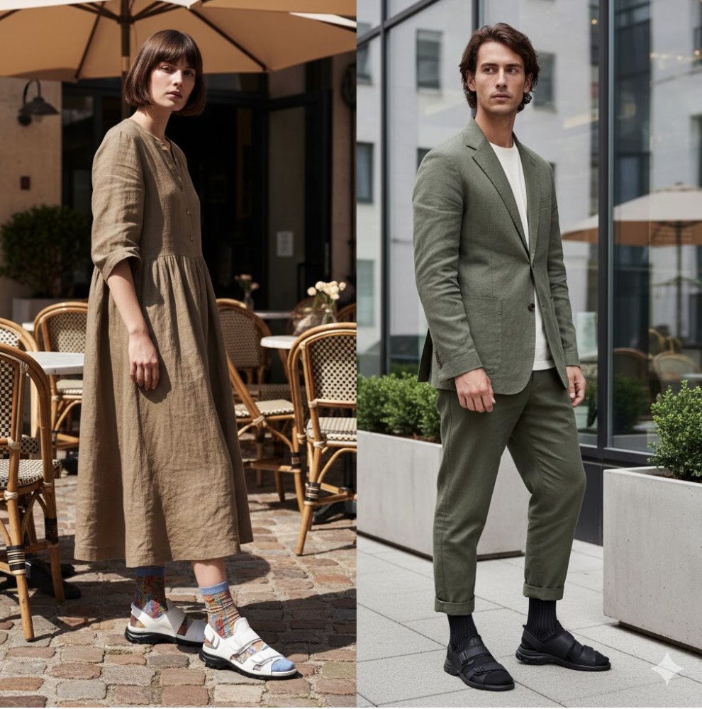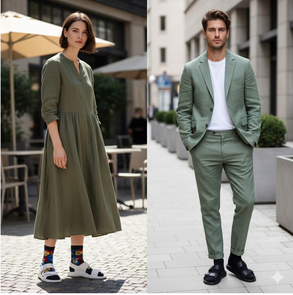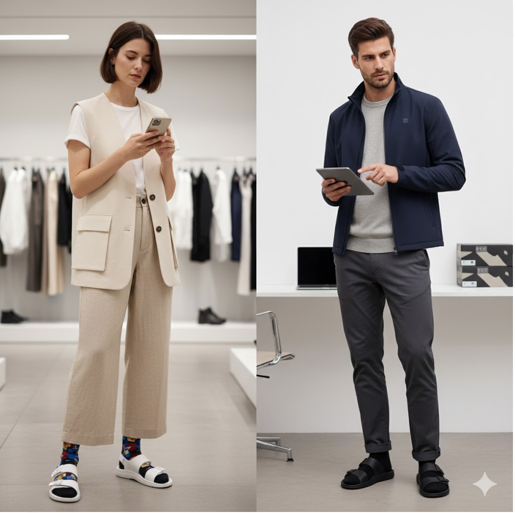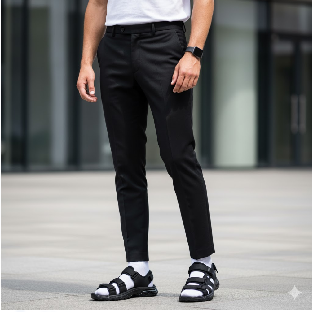 例えば、黒のスラックスに黒のサンダルを合わせ、白ソックスを挟むことで、モダンなモノトーンスタイルが手軽に作れます。