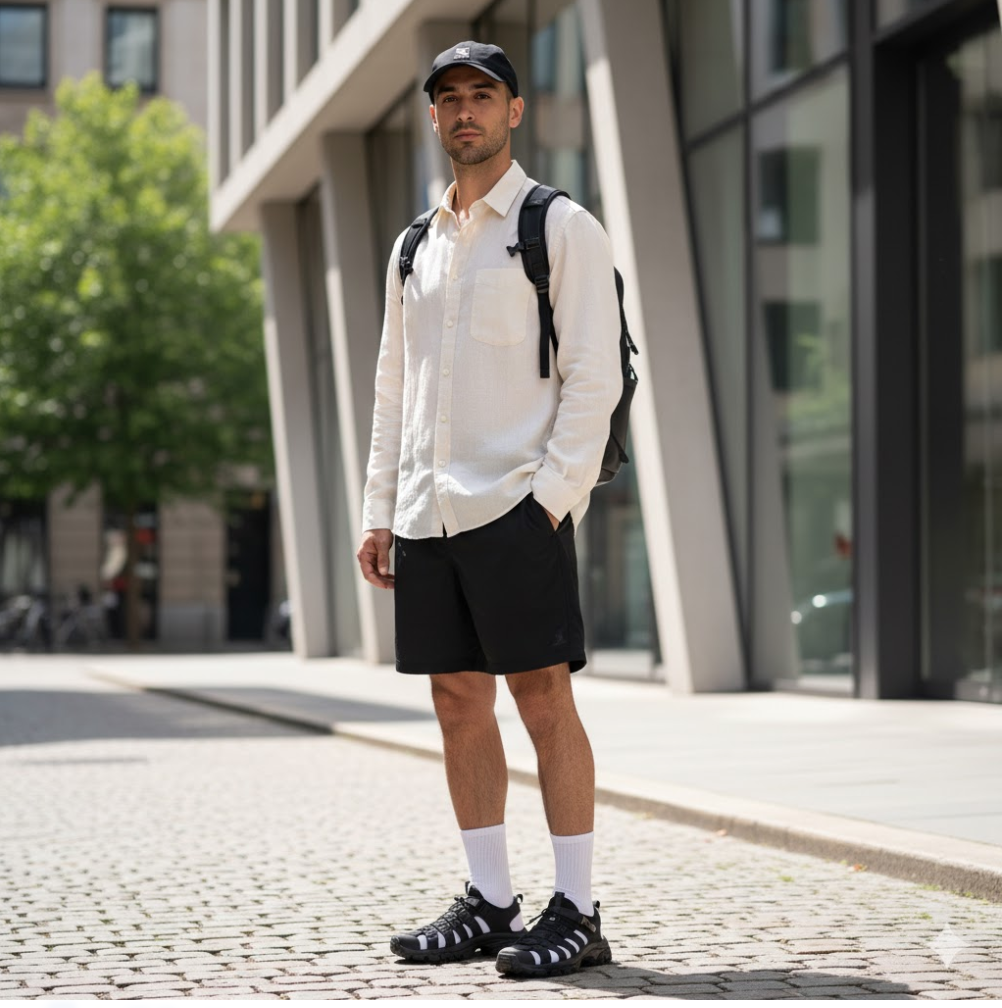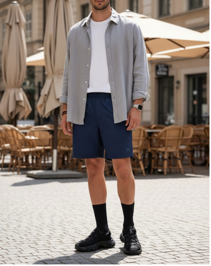 特に、撥水性や速乾性に優れたナイロン素材のテック系ショートパンツと合わせれば、機能的かつアクティブな印象が際立ちます。