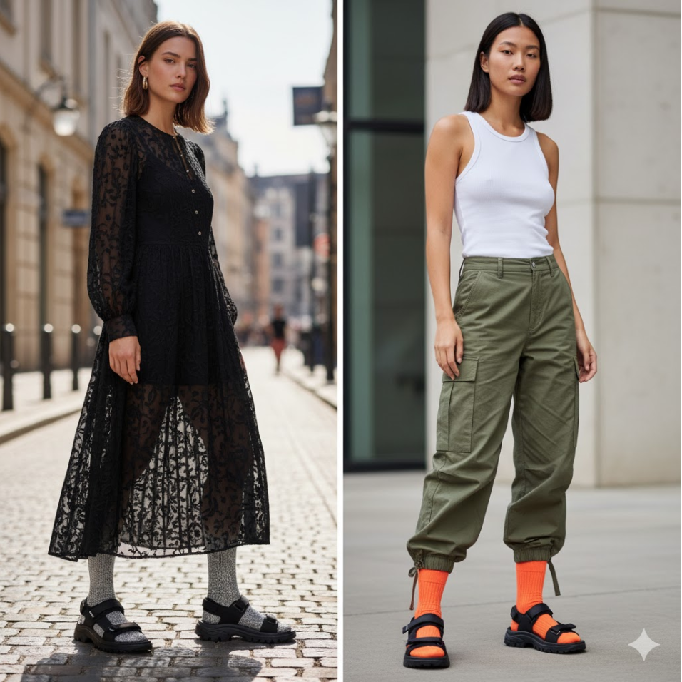 代表的な着こなしとして、シアー素材のワンピースや光沢のあるサテンスカートといったフェミニンなアイテムに、あえて無骨なサロモンサンダルを合わせる「甘辛MIX」スタイルは、もはや定番のテクニックです。