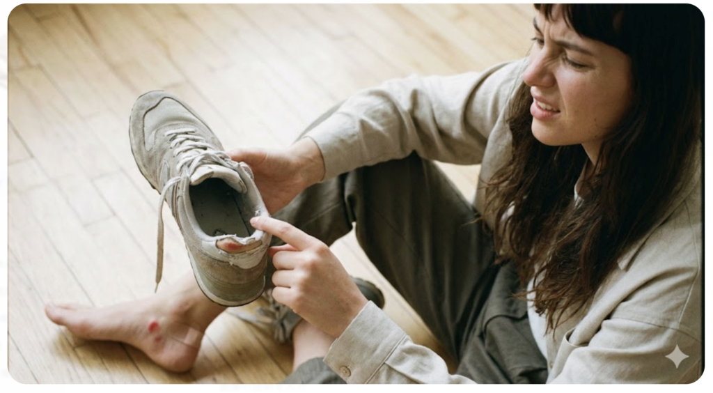 さらに、指でかかと内側をなぞったときに、ザラつき・段差・硬い角があるなら、芯材の欠けや変形を疑ってOK。逆に、皮膚が赤くなるだけで靴の内側は滑らかなら、靴ずれ寄りの可能性が上がります。