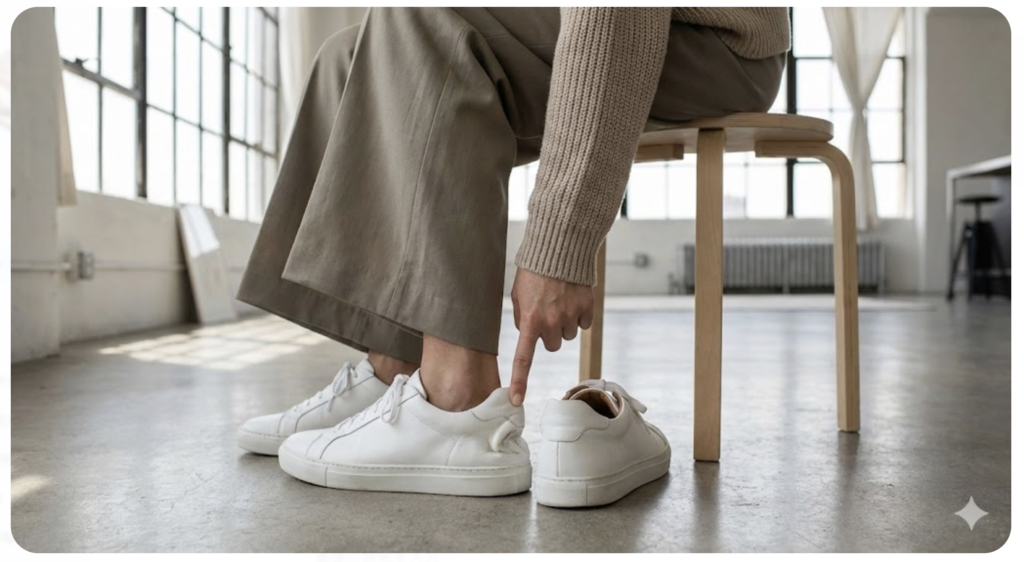 ひもを締めるだけで改善するなら、履き方が原因の可能性が高いです。締めてもパカパカするなら、サイズや足型の相性、インソール・ヒールグリップで調整する余地があるかを見ていきます。