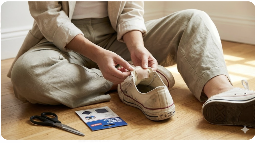 豆知識:靴ずれは「摩擦の回数」が増えるほど悪化します。かかとが浮いてパカパカしている場合は、皮膚を守るだけじゃなく、靴の中で足が動かない方向(ヒールグリップや紐の締め直し)にも同時に手を入れるのがコツです。