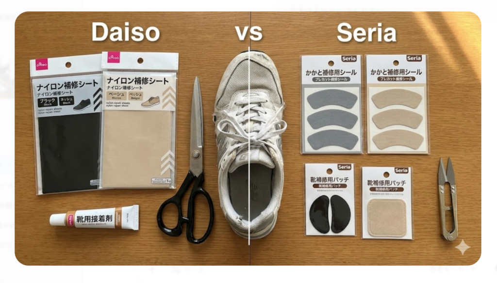 両社の店舗を巡ってリサーチした結果、スニーカー修理においては「素材としての強度とコスパならダイソー」「手軽さと見た目の自然さならセリア」という明確な使い分けが見えてきました。