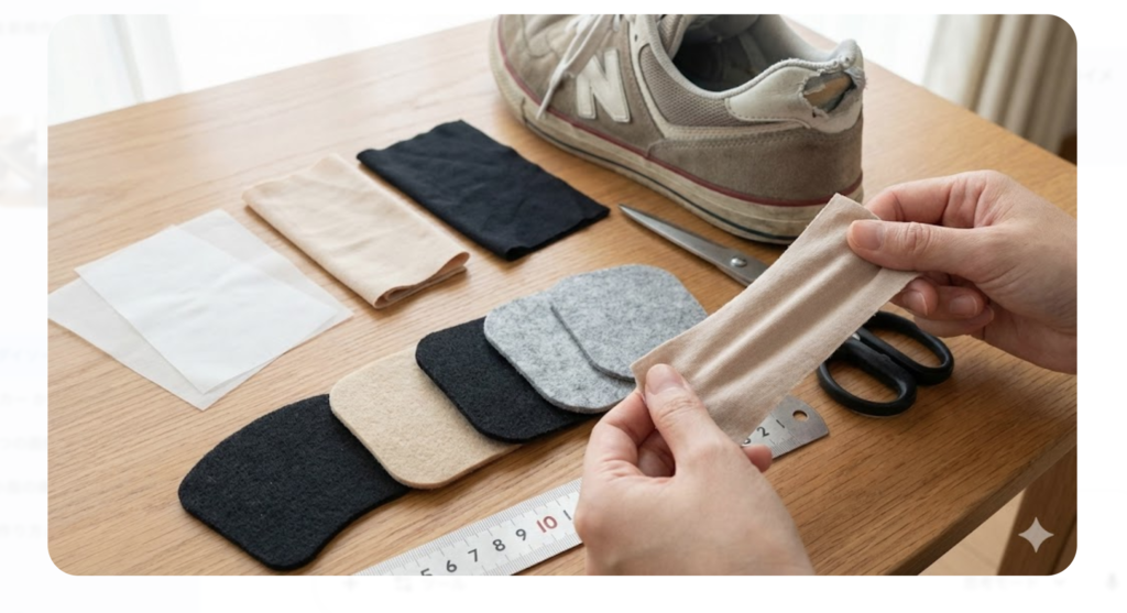 「靴補修用パッチ」などの名称で販売されており、角が最初から丸くカットされていたり、スニーカーの内側によくある「グレー」や「ベージュ」といった色が揃っていたりします。