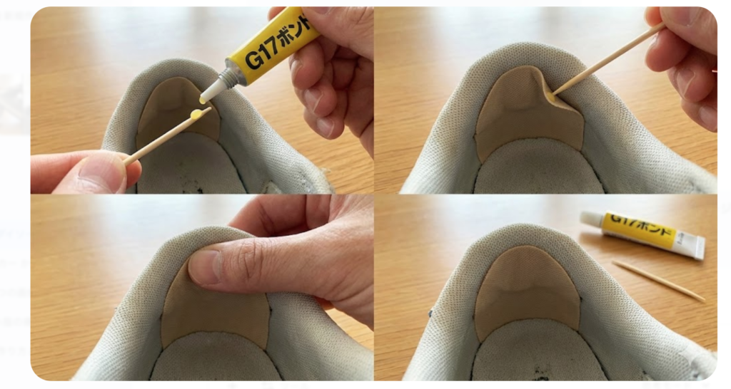 シールタイプの粘着力は強力ですが、靴の中という高温多湿かつ摩擦の激しい環境では、やはり限界があります。そこで、より完璧な仕上がりを目指すなら、「接着剤(ボンド)」のちょい足しをおすすめします。
