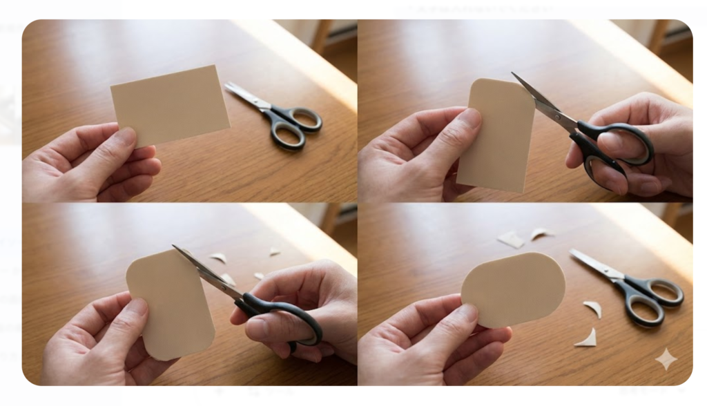 補修シートを、購入したままの四角形で貼っていませんか?あるいは、ハサミで切った直角の角(かど)をそのままにしていませんか?その「角」こそが、補修シートがすぐに剥がれてしまう最大の原因の一つなのです。