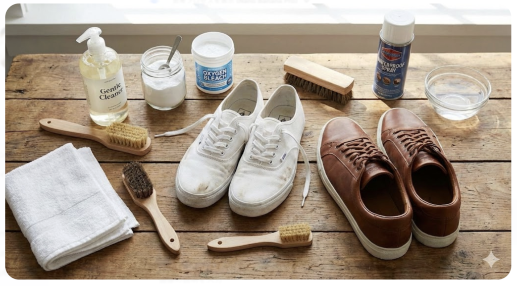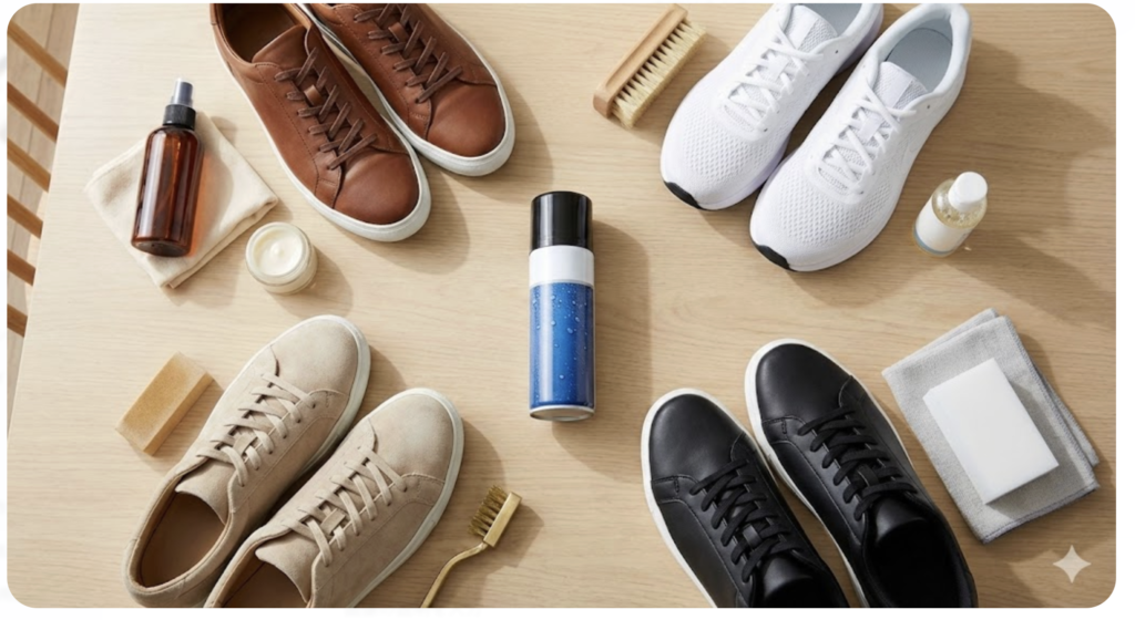 さらに、革・スエード・合皮・メッシュみたいに素材が違うと正解も変わるので、その辺も迷わないように整理します。最後は防水スプレーで汚れを寄せ付けない予防と、失敗しない乾燥(陰干し)まで。あなたの一足、ちゃんと復活させましょう。