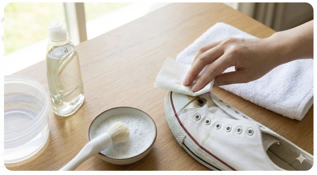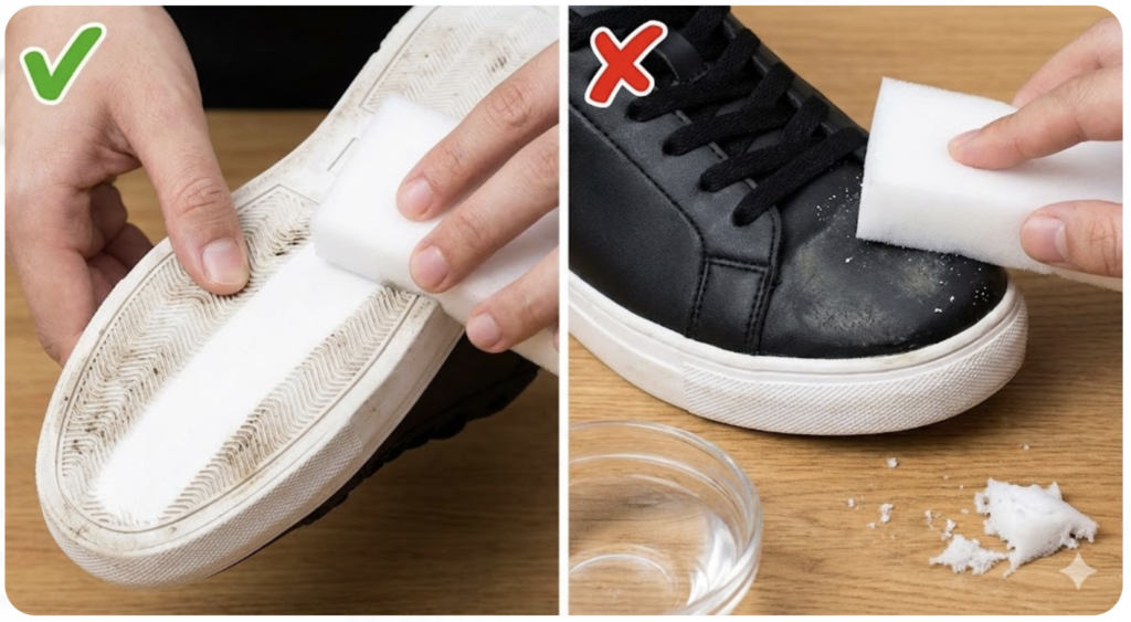 激落ちくんは使いどころを守れば神アイテムです。ソールはピカッと、アッパーは丁寧に。ここを分けるだけで失敗が減りますよ。