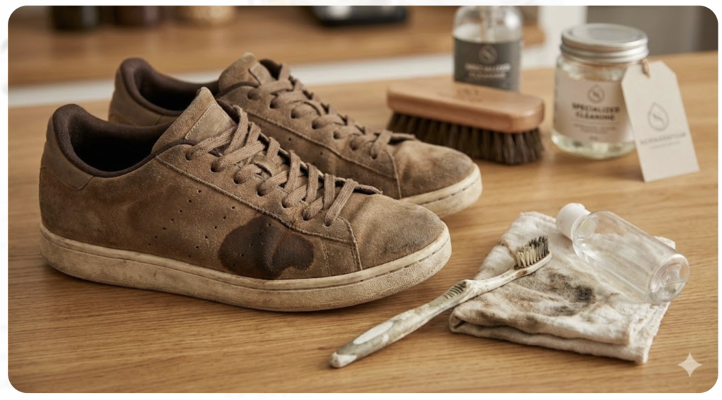 スエードに水や洗剤を使うと、輪ジミや硬化の原因になることがあります。どうしても落ちない場合は、専用クリーナーの使用や、専門家への相談が安全です。最終的な判断は専門家にご相談ください