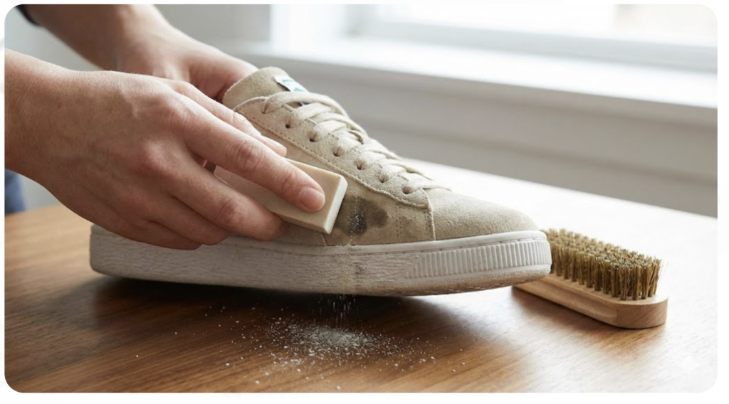 スエードは「落とす」より「目立たなくする」発想が大事です。擦りすぎると、その場所だけ毛が潰れて逆にムラが目立つことがあります。