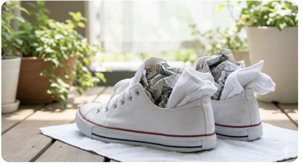 油汚れが落ちたのに「なんかスッキリしない」人の多くは、乾燥が甘いです。靴の中が湿っていると、ニオイが戻ったり、生乾き感が残ったりします。