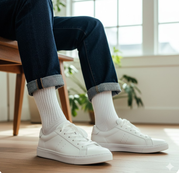 これを防ぐためには、くるぶし丈(アンクルソックス)やスニーカーソックスではなく、デニムの裾が肌やスニーカーの履き口に直接触れないよう、少し長めのクルーソックスを選びましょう。