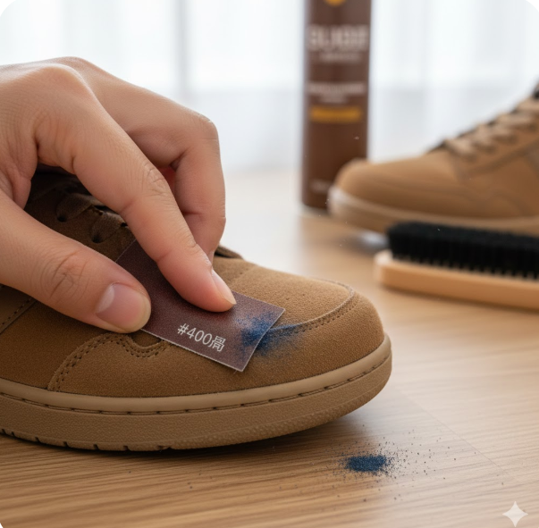 4. 補色と保護:削った部分は色が薄くなることがあるので、必要に応じてスエード用の補色スプレーを使い、最後に防水スプレーで保護します。