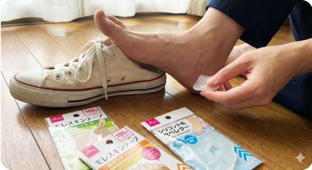 そこでおすすめなのが、セリアなどで販売されている「足先用(ハーフタイプ)インソール」や「つま先クッション」です。