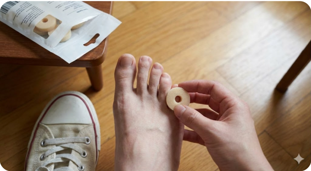 ドラッグストアでよく見かける、中央に穴が開いたドーナツ型の「魚の目パッド」。これもダイソーやセリアの衛生用品コーナーで手に入ります。