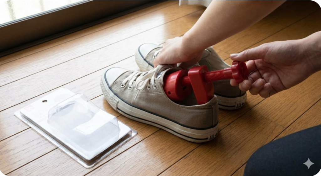 前述のシューズストレッチャーを使う場合も、このドライヤー加熱を併用することで、合皮などの伸びにくい素材でも効果が出やすくなります。