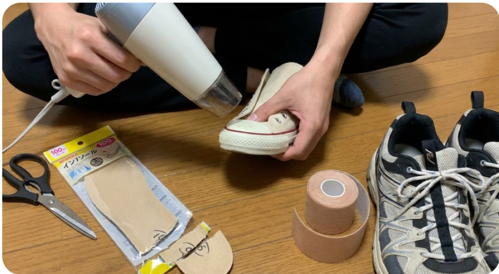 これは100均グッズと家にあるものを組み合わせた、少し上級者向けの裏技ですが、ドライヤーの熱を利用して靴の素材を柔らかくし、自分の足の形に成形する「ヒートストレッチ」という方法があります。