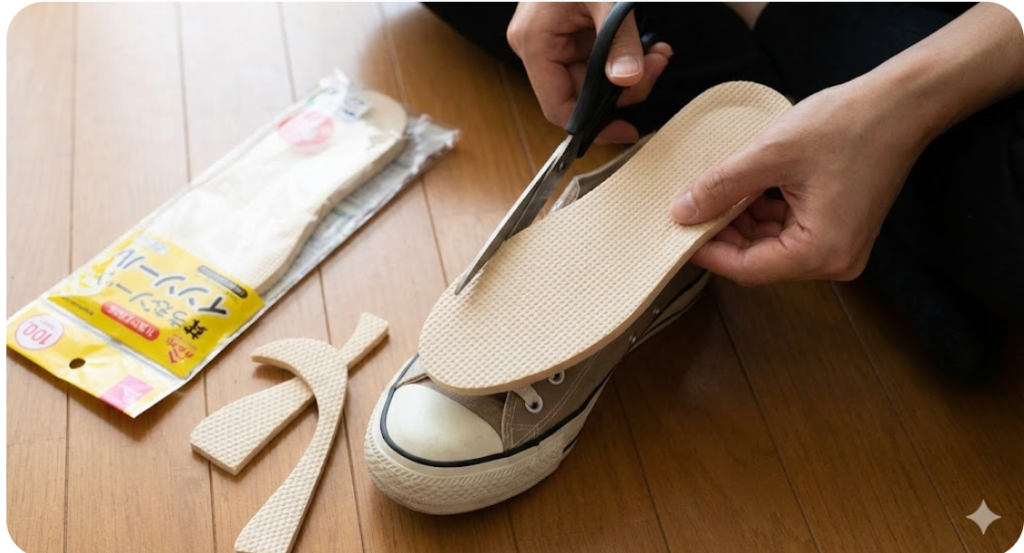 特にセリアの製品ラインナップの中には、インソール自体にスリット(切れ込み)が入っており、手で層を剥がすことで厚みを微調整できるタイプが存在します。