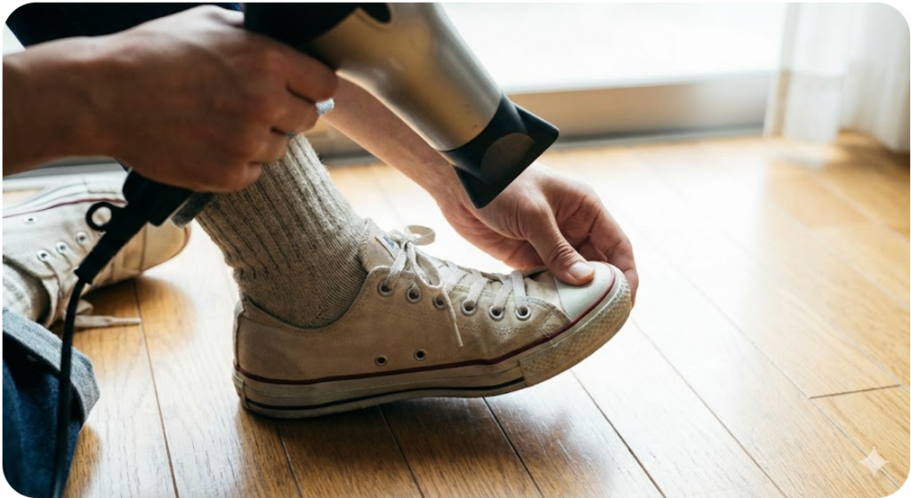- 加熱する:小指が当たって痛い部分に対し、ドライヤーの温風を20cm程度離した位置から当てます。一点集中ではなく揺らしながら、20〜30秒ほど温めて素材を軟化させます。