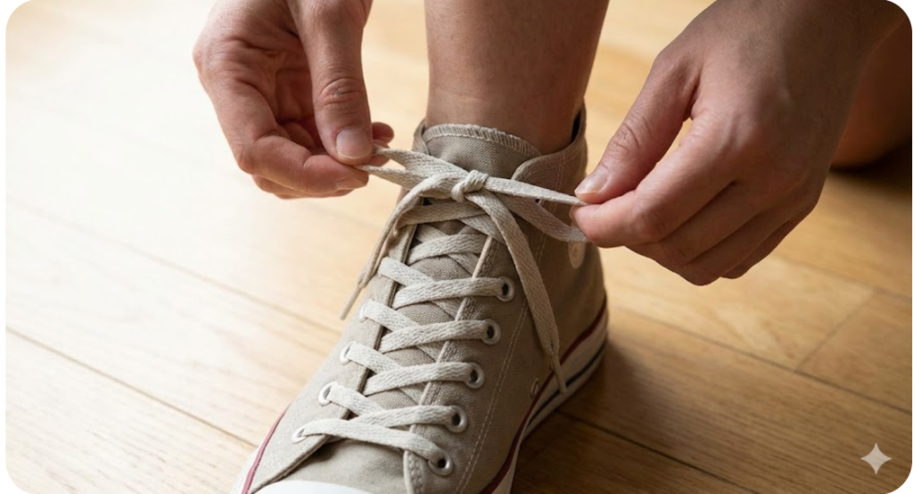 100均には「結ばない靴紐」や「伸縮ゴム靴紐」も売っていますが、まずは今ある紐でこの結び方を実践するだけでも十分な価値があります。